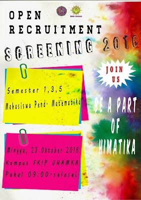 Jadi, ikuti lah open recuitment himatika *Screening Himatika 2016-2017* yang akan diselenggaraka pada :